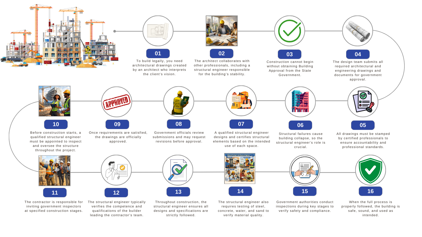 The process described below works in Nigeria. If this process is followed through there will be no problems. But the process described below is only followed through in a tiny fraction of the buildings which are erected.