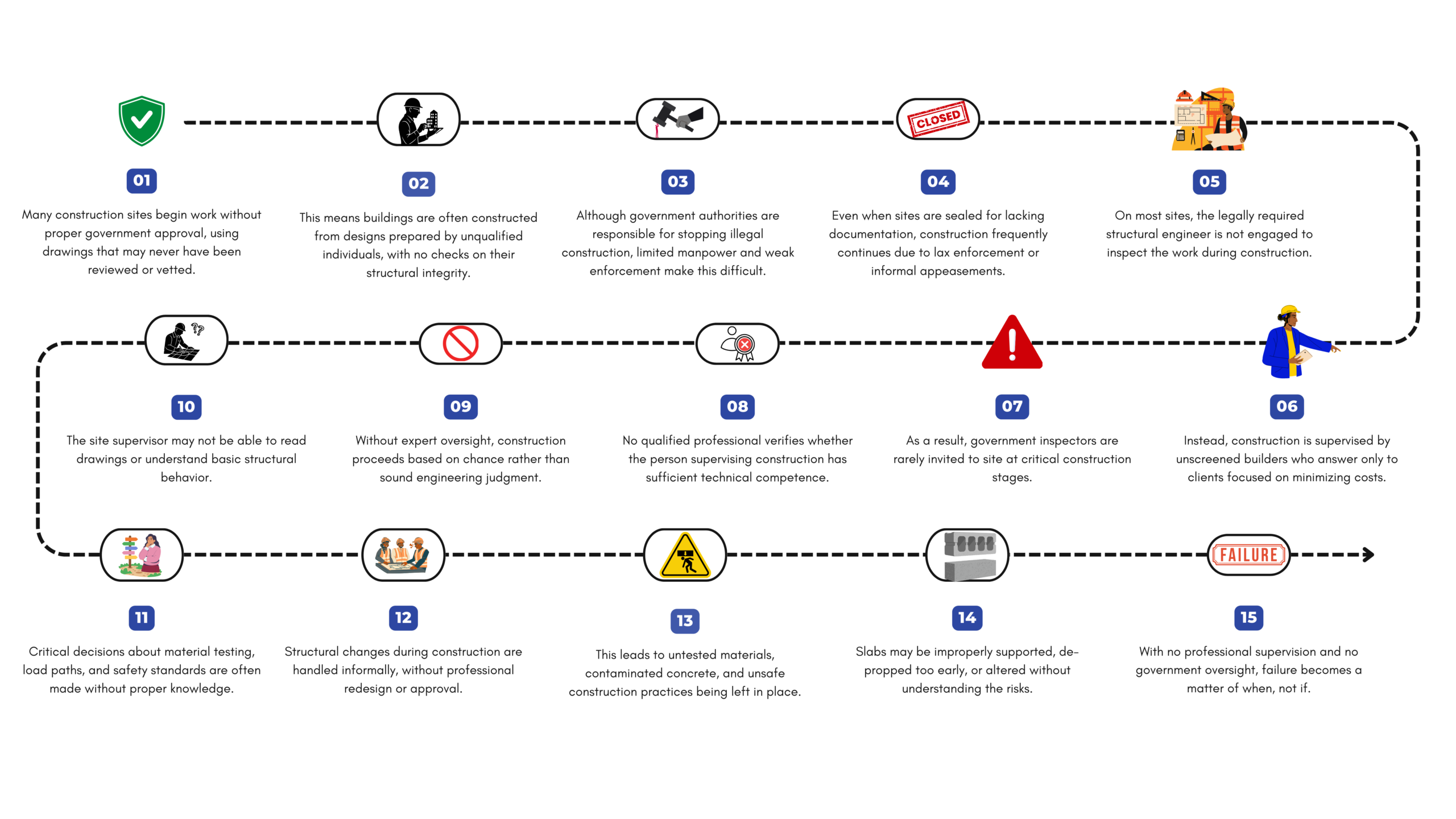 The aftermath is the same: outrage; blame; half-hearted investigations; petty arrests; increased legislation; blind over-enthusiasm from the authorities for the next few weeks; and then back to normal… until the next building collapse. The unfortunate truth is this: until the core problems are identified and addressed, not a single difference will be made.